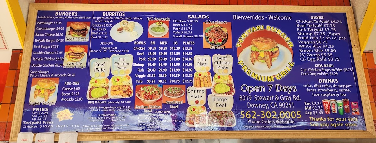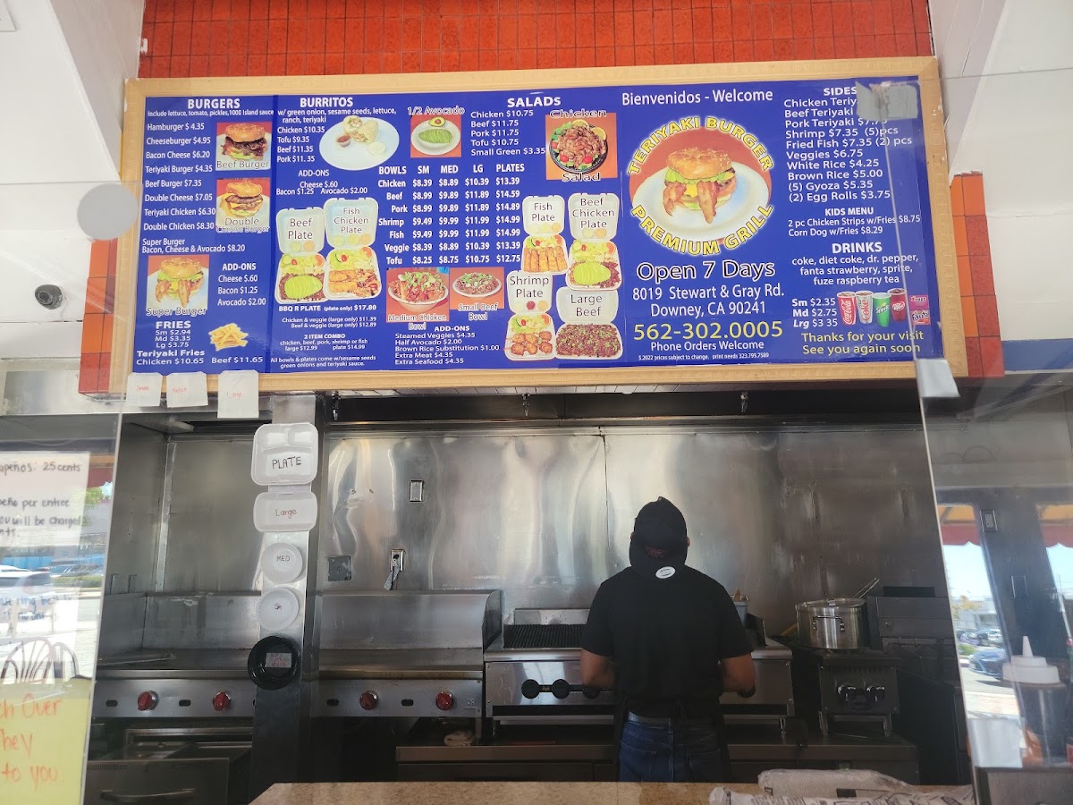 The Teriyaki Burger Premium Grill Menu at 8019 Stewart and Gray Rd in Downey, California, is a satisfying blend of classic American comfort food and flavorful Asian-inspired favorites, all served in a relaxed, come-as-you-are setting. From the moment you browse their all-day offerings, you’ll notice a menu built around variety, freshness, and generous portions. Their bowls are a signature highlight-guests can choose from Chicken, Beef, Pork, Shrimp, or Fish, each served with perfectly grilled protein, tender vegetables, and the kind of rich teriyaki glaze that makes the dish both savory and slightly sweet. Every bowl feels hearty yet balanced, ideal for a quick lunch or a filling dinner. For something a little different, the burrito section brings an unexpected twist. The Tofu, Chicken, Beef, and Pork Burritos blend grilled flavors with the satisfying wrap of a warm tortilla, while the Cali Burrito stands out for its crowd-pleasing mix of textures and California-style flair.
